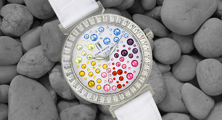 A questa natura ricca, incontaminata, alla sua esplosione di colori si ispirano gli orologi Capri Watch. I quadranti tempestati di cristalli Swarovski sono un richiamo al blu del mare di Capri che si mescola alle tonanità cristalline del verde smeraldo e dell’indaco, al rosso dei tramonti che sfuma nel giallo e nell’ocra, fino a confondersi con il fucsia. Tutto all’insegna delle atmosfere gioiosamente informali e raffinatamente scanzonate di cui Capri è diventata simbolo e che la nuova Rossella Collection esprime.