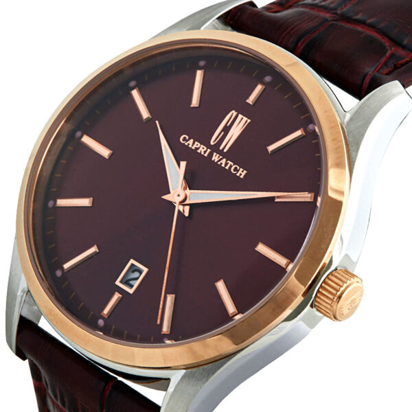 Rivivi il fascino del passato con questo orologio Retrò da uomo, perfetto equilibrio tra stile classico e dettagli contemporanei. Il quadrante bordeaux con datario integrato regala un tocco di originalità e raffinatezza. La ghiera placcata in oro rosa incornicia la cassa in acciaio, mentre il cinturino in vera pelle bordeaux completa il look con una finitura elegante e vintage.