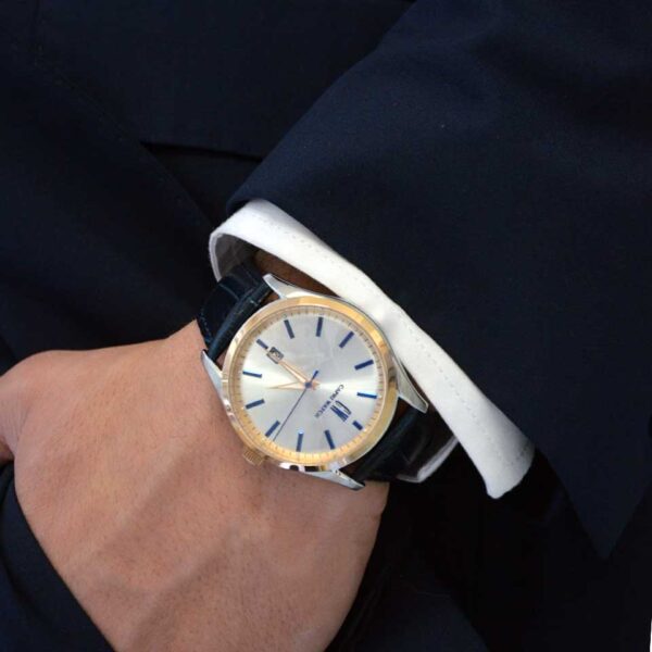 Scopri l’inconfondibile stile retrò dell’orologio Sunray, caratterizzato da un quadrante color argento con datario e indici blu che ne esaltano la leggibilità. La ghiera placcata oro rosa e la cassa in acciaio conferiscono un aspetto raffinato, mentre il cinturino blu in pelle aggiunge un tocco elegante di classe.