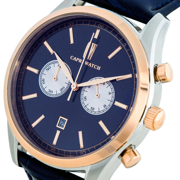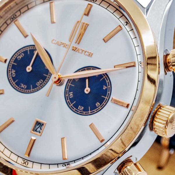 Eleganza vintage e design sofisticato si incontrano nel Cronografo Sunray Blue Bimetal da uomo, perfetto per chi ama uno stile classico con un tocco moderno. Il quadrante blu scuro con datario garantisce leggibilità e funzionalità, mentre la ghiera placcata oro rosa aggiunge un raffinato dettaglio di lusso.
