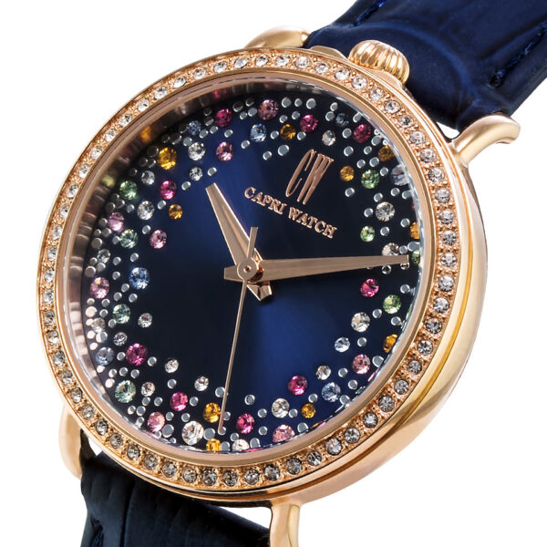Scopri il fascino dell’Orologio Retrò Mini StormColor Blu Navy, un accessorio che unisce eleganza e design vintage con un tocco moderno. Il quadrante blu effetto soleil è arricchito da una tempesta di cristalli Swarovski colorati creando un meraviglioso gioco di luci. La ghiera decorata con cristalli Swarovski, e la corona a ore 12 richiamano lo stile degli orologi da taschino, aggiungendo un tocco retrò unico. La cassa in acciaio placcato oro rosa e il cinturino blu in pelle ne completano l’eleganza.