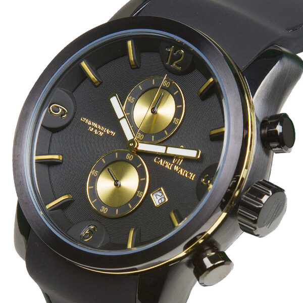 Il Cronografo KarbonColor Yellow Gold è l’orologio perfetto per chi cerca un accessorio moderno, dinamico e di grande impatto. Il quadrante nero, arricchito dal datario e da indici dorati con effetto 3D, conferisce profondità creando un look audace e distintivo. La cassa in acciaio IP Full assicura robustezza e resistenza, mentre il cinturino in silicone nero garantisce comfort per l’uso quotidiano. Il KarbonColor è il compagno ideale per chi apprezza la precisione e l’affidabilità di un movimento cronografico.