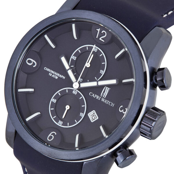Un omaggio all’eleganza senza tempo di Capri. Questo cronografo dallo stile sportivo ed esclusivo presenta un quadrante ispirato al celebre orologio del campanile della Piazzetta di Capri, simbolo dell’isola. La cassa e la ghiera blu donano al modello una forte presenza al polso, mentre il cinturino in silicone blu con impunture gialle aggiunge un tocco di dinamicità e carattere.