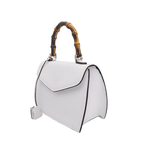 Realizzata in pelle di vitello con stampa Alce, si distingue per la sua luminosità raffinata e per i dettagli curati: il manico in bambù, simbolo di eleganza dal fascino retrò, e la tracolla regolabile che garantisce praticità e comfort.