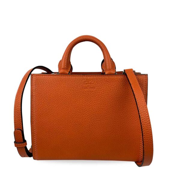 Spirito dinamico e anima artigianale: la Valeria color Arancio è lavorata in pelle di vitello con grana Alce. Internamente troviamo una fodera in pelle e una struttura a tre comparti, con chiusura a cerniera centrale per maggiore sicurezza.