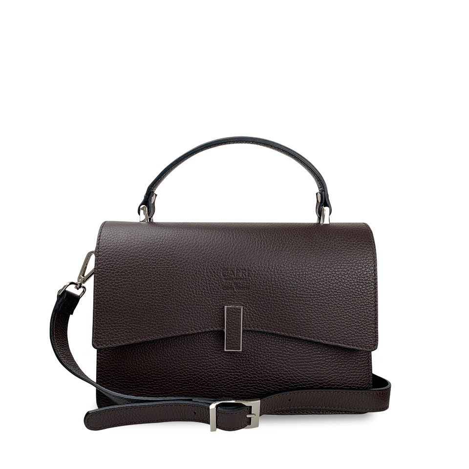 Borsa Alba, realizzata in pelle “pieno fiore” di vitello con “stampa Alce”, foderata internamente in pelle, con tracolla.