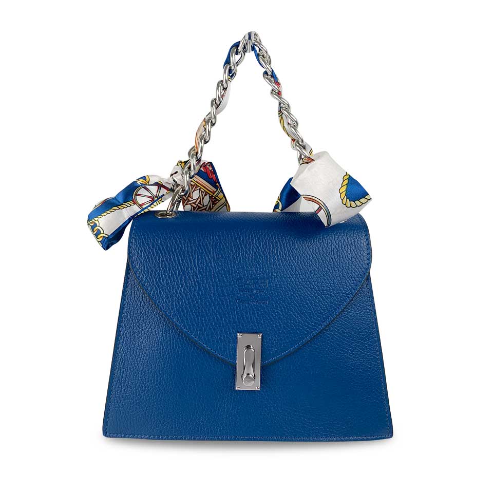 Borsa con manico a catena impreziosito da un foulard intrecciato e tracolla. Chiusura con pattina e clip magnetico.