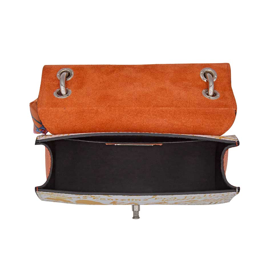 Il manico a catena arricchito da foulard coordinato dona un tocco glamour, mentre la chiusura metallica frontale garantisce praticità e sicurezza. Grazie alla tracolla regolabile e removibile, questa borsa può essere portata comodamente a spalla o crossbody, adattandosi a diverse occasioni della giornata.
