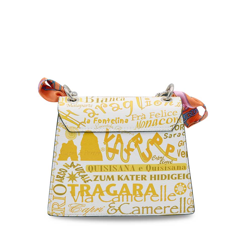 Esprimi il tuo amore per Capri con questa originale borsa a spalla in pelle, decorata con una vivace stampa tipografica che racchiude i nomi e i luoghi simbolo dell’isola. Il design moderno, in un giallo vivace su fondo bianco, regala un tocco solare e dinamico, mentre il foulard arancione intrecciato nella catena aggiunge un dettaglio chic e raffinato.