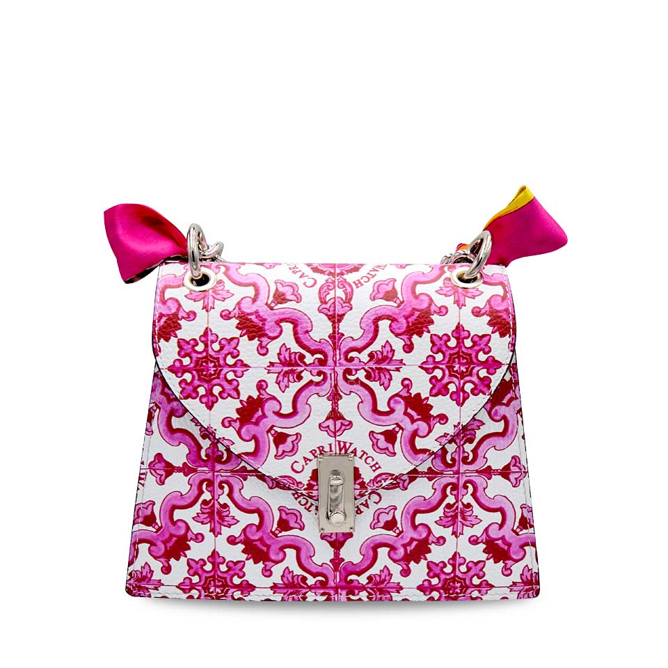 Scopri l’eleganza della nostra borsa a spalla in pelle, arricchita da dettagli unici in maioliche fucsia che donano un tocco di colore vibrante e originale. Il design si completa con un foulard intrecciato al manico, perfetto per aggiungere stile e personalità al tuo outfit quotidiano.