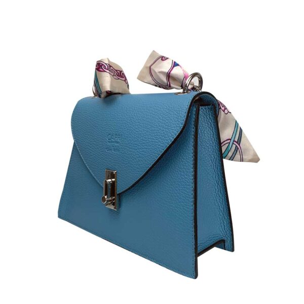 Il design strutturato e la chiusura metallica a scatto garantiscono sicurezza ed eleganza, mentre il manico in catena impreziosito da foulard in tessuto blu aggiunge un dettaglio ricercato e molto femminile. Grazie alla tracolla aggiuntiva regolabile e removibile, può essere indossata sia a spalla che crossbody, rendendola versatile per il giorno e la sera.