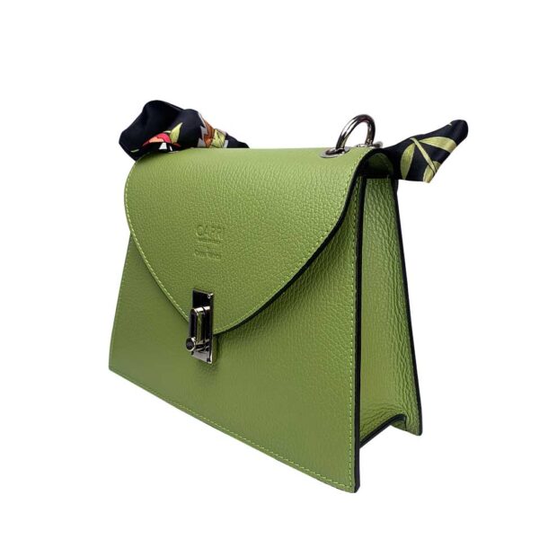 La Borsa Foulard nella delicata tonalità verde chiaro unisce stile e praticità in un design raffinato. Il manico in metallo, intrecciato con un foulard verde tenue, dona un’allure fresca e sofisticata a questo accessorio unico. Grazie alla tracolla rimovibile, la borsa si adatta facilmente a diverse occasioni, mentre la chiusura con pattina e clip garantisce una protezione ottimale. Con le sue dimensioni contenute, è perfetta per completare outfit con un tocco di leggerezza e modernità.