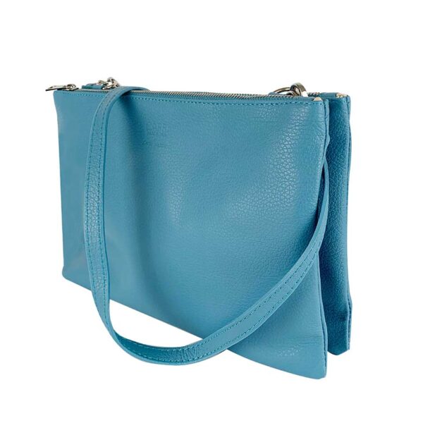 La borsa a tracolla da donna in pelle Blu Baby è realizzata interamente in vera pelle, è compatta nelle dimensioni ma sorprendentemente capiente.