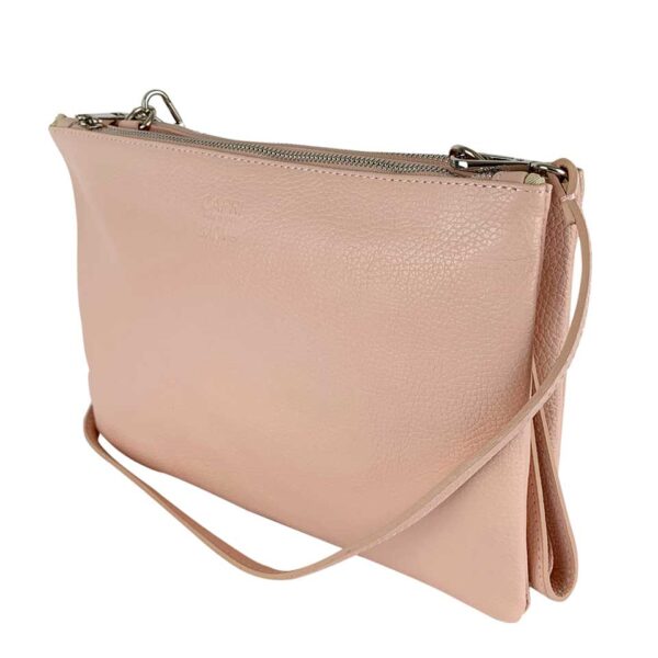 Dotata di manico in pelle e tracolla abbinata, può essere indossata a mano, a spalla o crossbody, adattandosi con stile a ogni occasione. La catena in metallo lucido conferisce alla pochette un’aria sofisticata e femminile, perfetta per outfit casual-chic o più formali.