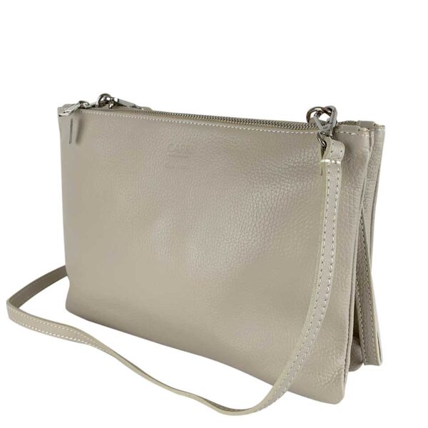 Borsa con tracolla Beige interamente realizzata in pelle. Doppia chiusura con cerniera e pattina, impreziosita da particolari in acciaio. L’interno foderato in stoffa presenta una tasca con cerniera. Dotata di piedini di appoggio. Dimensioni: Base: 21 cm Altezza: 19 cm Profondità: 8 cm