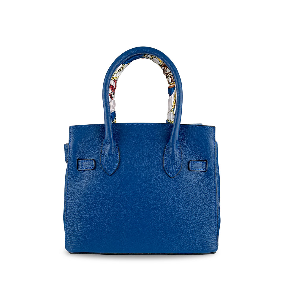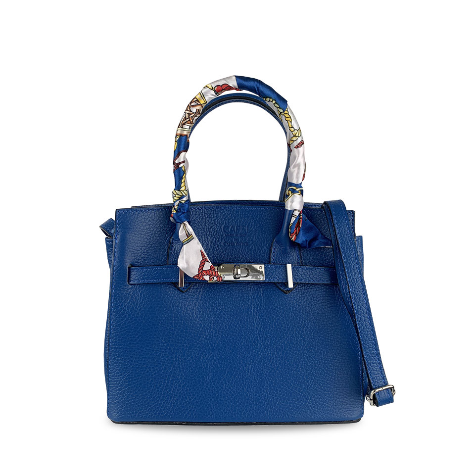 Questa borsa a spalla in pelle, nella raffinata tonalità blue royal, è impreziosita da una grafica tipografica che celebra i simboli e i nomi più iconici di Capri. Il blu intenso regala un’eleganza senza tempo, mentre il foulard fantasia intrecciato alla catena aggiunge un tocco sofisticato e un contrasto visivo d’impatto.