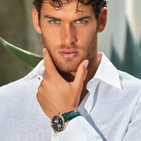 Il Chrono Sunray Dark Green fonde eleganza e funzionalità. Il quadrante verde scuro con chrono e datario offre un design sofisticato e di facile lettura, perfetto per ogni occasione. Il cinturino verde in pelle completa il look con un contrasto elegante, rendendo questo cronografo ideale per chi cerca uno stile raffinato.