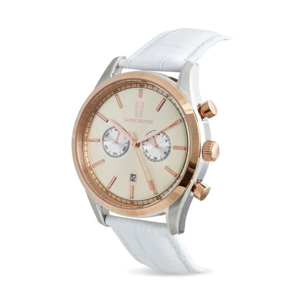 Il Chrono Sunray White è l’espressione perfetta dell’ eleganza senza tempo. Il quadrante champagne con chrono e datario offre un design sofisticato, arricchito dalla ghiera placcata in oro rosa che aggiunge un ulteriore tocco di lusso. La cassa in acciaio e il cinturino bianco in pelle creano un contrasto fresco e elegante, rendendo questo orologio l’ accessorio ideale per un look moderno.
