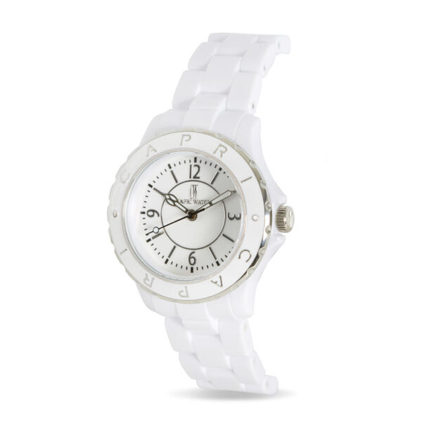 L’Orologio Jelly First Bianco è un omaggio all’iconico orologio del campanile di Capri grazie al quadrante che ne richiama il design. La ghiera “Capricapri” incornicia con eleganza la cassa, creando un equilibrio perfetto tra tradizione e modernità. La cassa e il cinturino a maglie, interamente realizzati in policarbonato bianco, donano leggerezza e uno stile fresco.