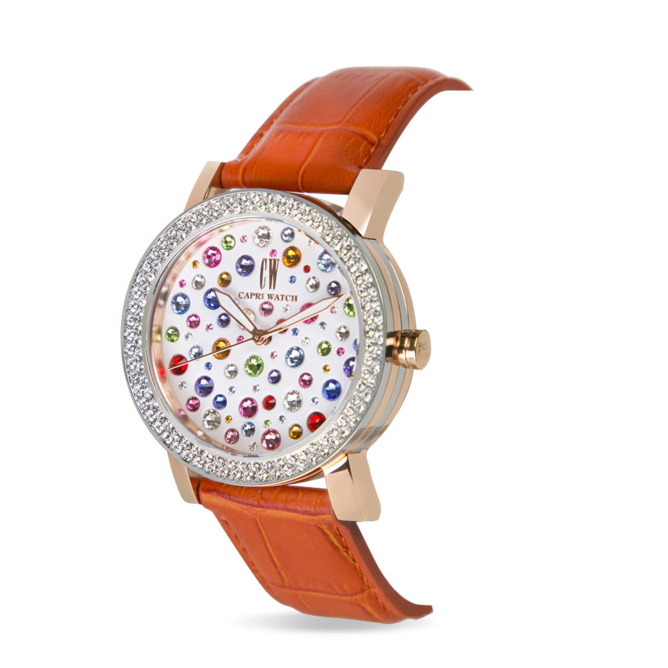 Scopri l’Orologio Capri Watch MultiJoy Classic Orange, un accessorio che unisce stile, colore e raffinatezza. Parte della celebre collezione MultiJoy, questo orologio da donna è caratterizzato da un quadrante bianco impreziosito da cristalli Swarovski di vari colori e dimensioni, che catturano la luce con eleganza. La ghiera in acciaio, arricchita da cristalli bianchi, e la cassa bimetal in acciaio e oro rosa conferiscono un tocco di lusso al design. Il cinturino in pelle arancione aggiunge un accento di colore vivace, rendendo questo orologio perfetto per ogni occasione.