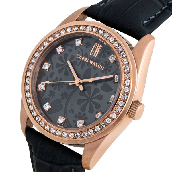 Eleganza raffinata e dettagli preziosi caratterizzano l’Orologio XX Collection da donna, pensato per chi ama uno stile femminile e sofisticato. Il quadrante grigio scuro è decorato con un delicato motivo floreale e arricchito da indici in cristalli Swarovski, che donano luce e brillantezza. La ghiera è impreziosita da una fila di cristalli bianchi lungo il perimetro, per un effetto luminoso e prezioso. La cassa in acciaio placcato oro rosa aggiunge un tocco caldo e raffinato, mentre il cinturino in pelle grigia completa il design con morbidezza e comfort.