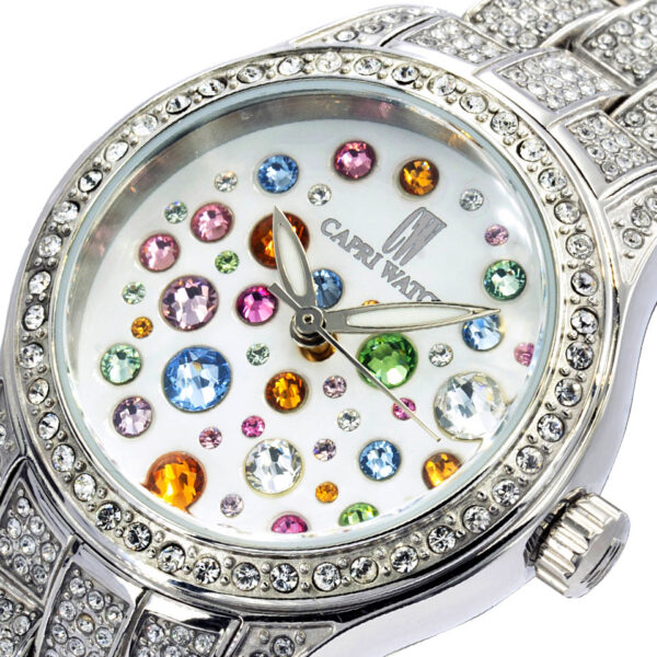 Il Chrono Paola Multijoy Silver riesce a fondere funzionalità e bellezza. Il quadrante è arricchito da colorati cristalli Swarovski, creando un gioco di luce unico. La ghiera, la cassa e il cinturino a maglie sono realizzati in acciaio e ne fanno un modello elegante e resistente al tempo stesso.