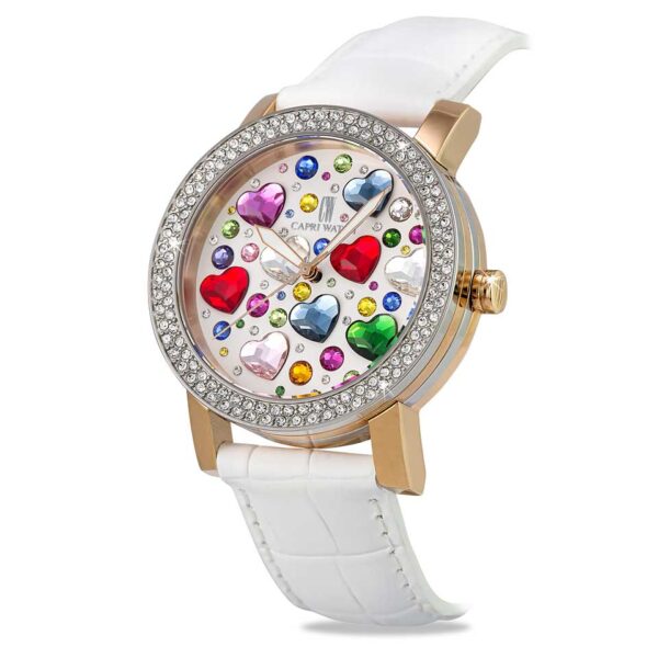 L’Orologio XX Multijoy Colored Hearts è caratterizzato da un quadrante bianco impreziosito da cristalli Swarovski colorati a forma di cuori, simbolo di amore e romanticismo. La ghiera arricchita da un pavè di cristalli incornicia la cassa in acciaio bimetal, robusta e preziosa. Il cinturino in pelle bianca completa il design di questo accessorio unico e raffinato.