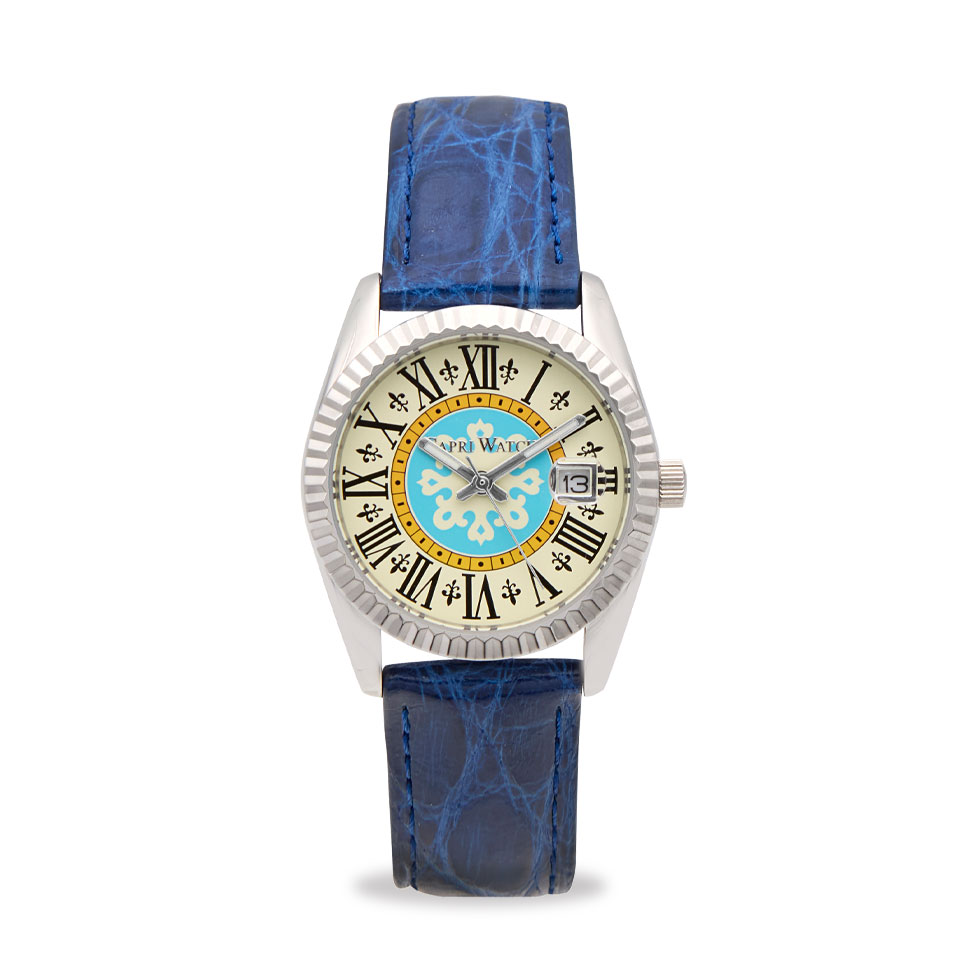 Un accessorio dal fascino intenso che celebra lo stile mediterraneo con un tocco sofisticato. Il cinturino in Blu Navy in coccodrillo, elegante e profondo, mette in risalto il quadrante ispirato al campanile della Piazzetta di Capri, icona intramontabile dell’isola. La cassa in acciaio con finitura zigrinata e il datario posizionato a ore 3 uniscono praticità e ricercatezza estetica. Un orologio capace di esprimere stile, qualità e personalità senza tempo.