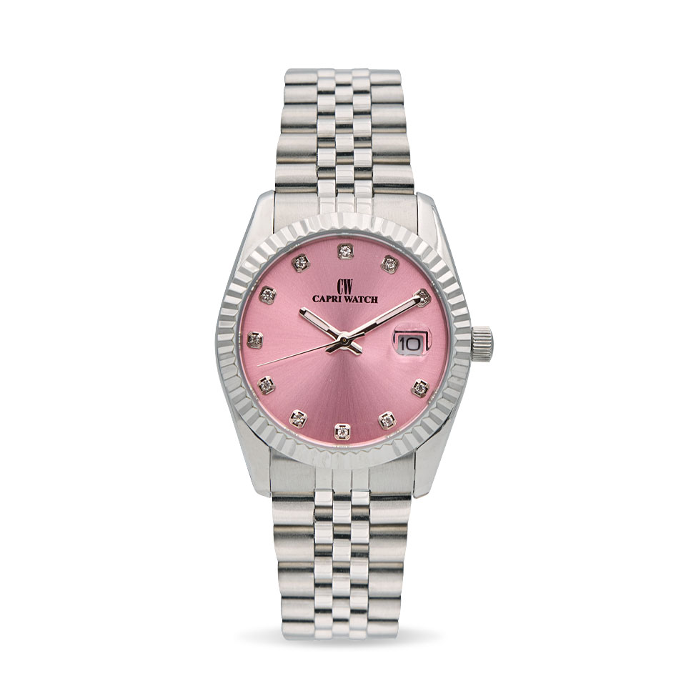 L’Eternity Stainless Fucsia è un orologio da donna che unisce stile e praticità in modo impeccabile. La cassa e il cinturino in acciaio donano robustezza e un aspetto moderno, ideale per chi predilige un design sobrio ma con un tocco di colore deciso. Gli indici con piccoli cristalli bianchi conferiscono una nota di eleganza in più. Il datario integrato aggiunge funzionalità, rendendo questo modello perfetto per l’uso quotidiano.