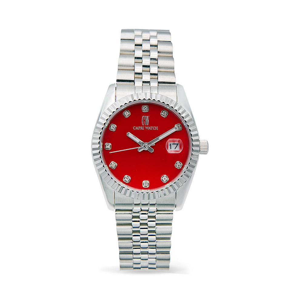 Il quadrante rosso brillante cattura immediatamente lo sguardo, impreziosito da dodici cristalli che segnano le ore e aggiungono un tocco di lusso raffinato. Ghiera e cinturino in acciaio a maglie completano il design, rendendo l’orologio versatile: perfetto sia per outfit formali che per look casual di tendenza.