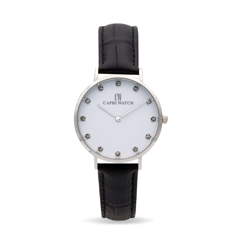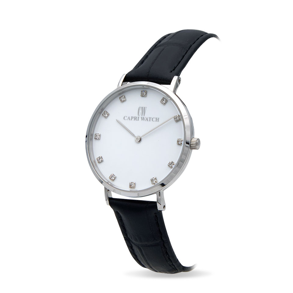 Questo modello Minimal con quadrante bianco e cinturino in pelle nera esprime l’essenza del design minimalista, raffinato e senza tempo. Gli indici in cristalli bianchi illuminano il quadrante, creando un delicato gioco di luce, mentre la cassa in acciaio ne valorizza la preziosità.