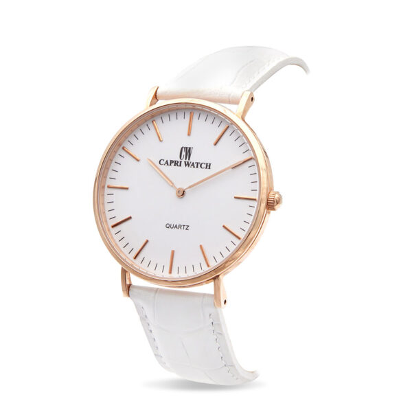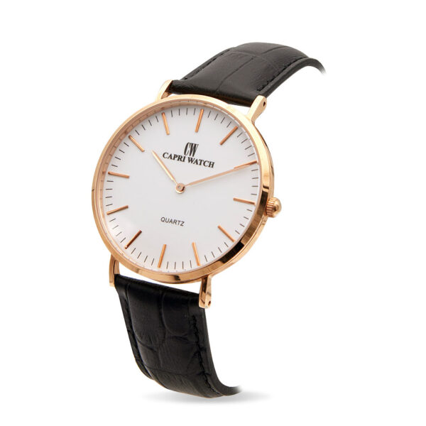 Semplicità, precisione e stile italiano caratterizzano il Capri Watch Minimal Rosè White Black. 2eee4Il quadrante bianco pulito, con indici lineari e sottili lancette dorate, è racchiuso in una cassa in acciaio color oro rosa, per un look essenziale e raffinato.