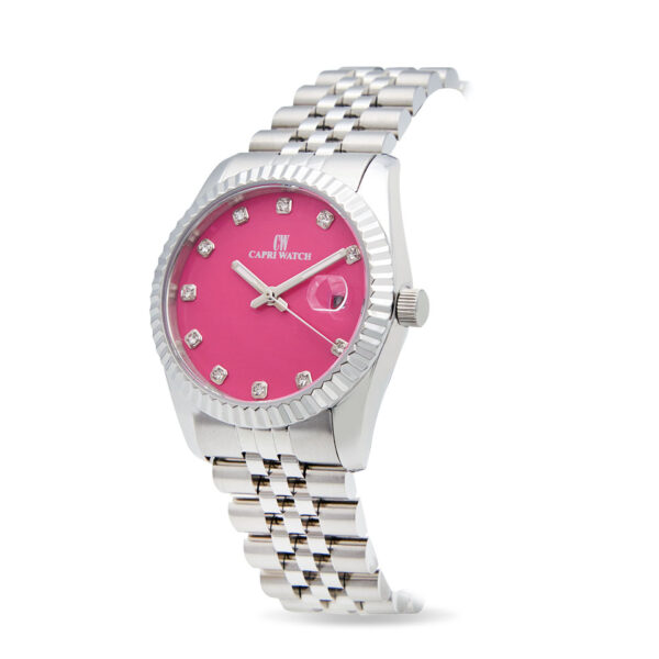L’Eternity Stainless Fucsia è un orologio da donna che unisce stile e praticità in modo impeccabile. La cassa e il cinturino in acciaio donano robustezza e un aspetto moderno, ideale per chi predilige un design sobrio ma con un tocco di colore deciso. Gli indici con piccoli cristalli bianchi conferiscono una nota di eleganza in più. Il datario integrato aggiunge funzionalità, rendendo questo modello perfetto per l’uso quotidiano.