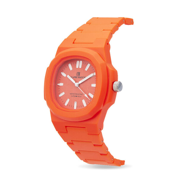 Il quadrante arancione brillante, perfettamente coordinato al cinturino, è arricchito da indici bianchi in rilievo che garantiscono una lettura chiara dell’ora e un contrasto visivo elegante.