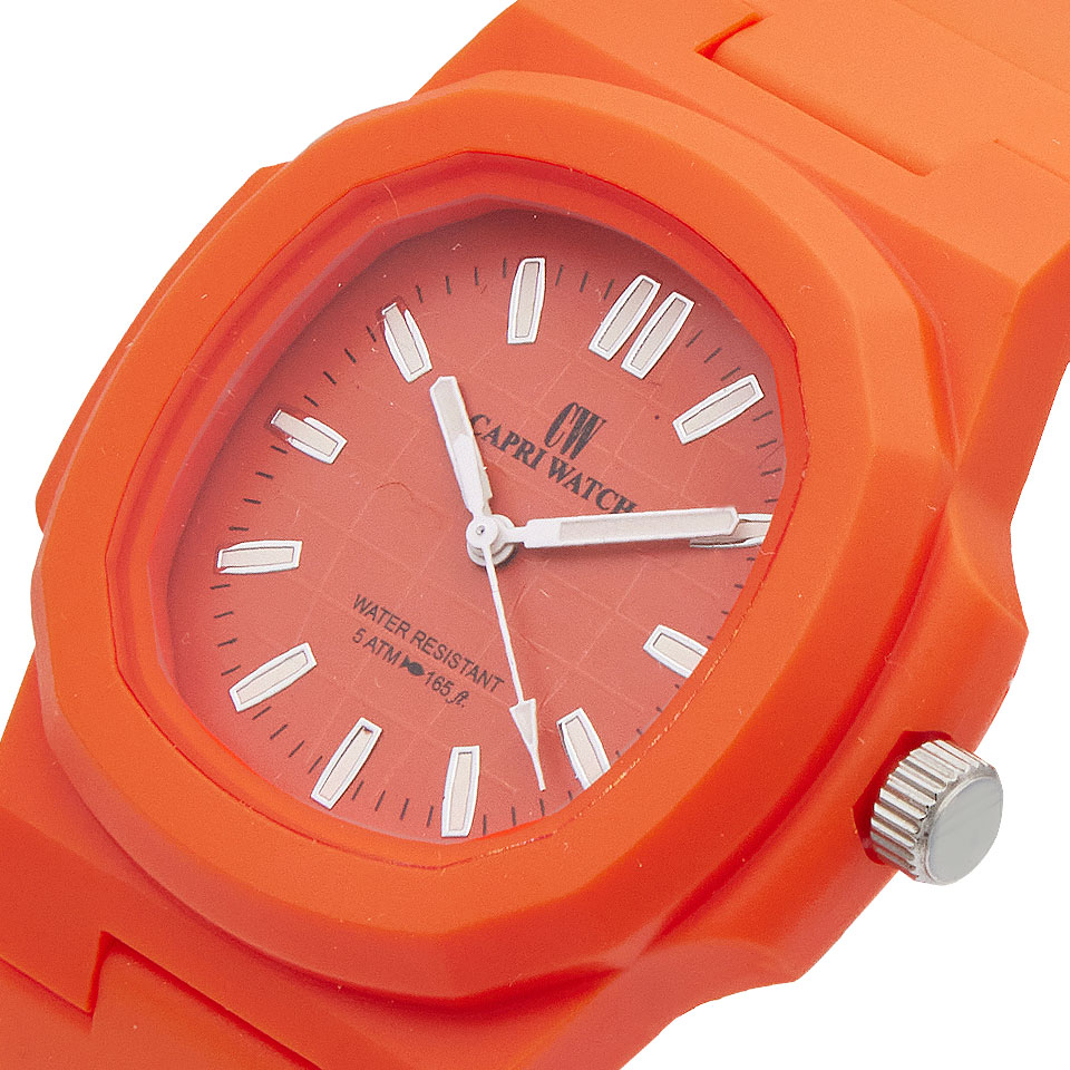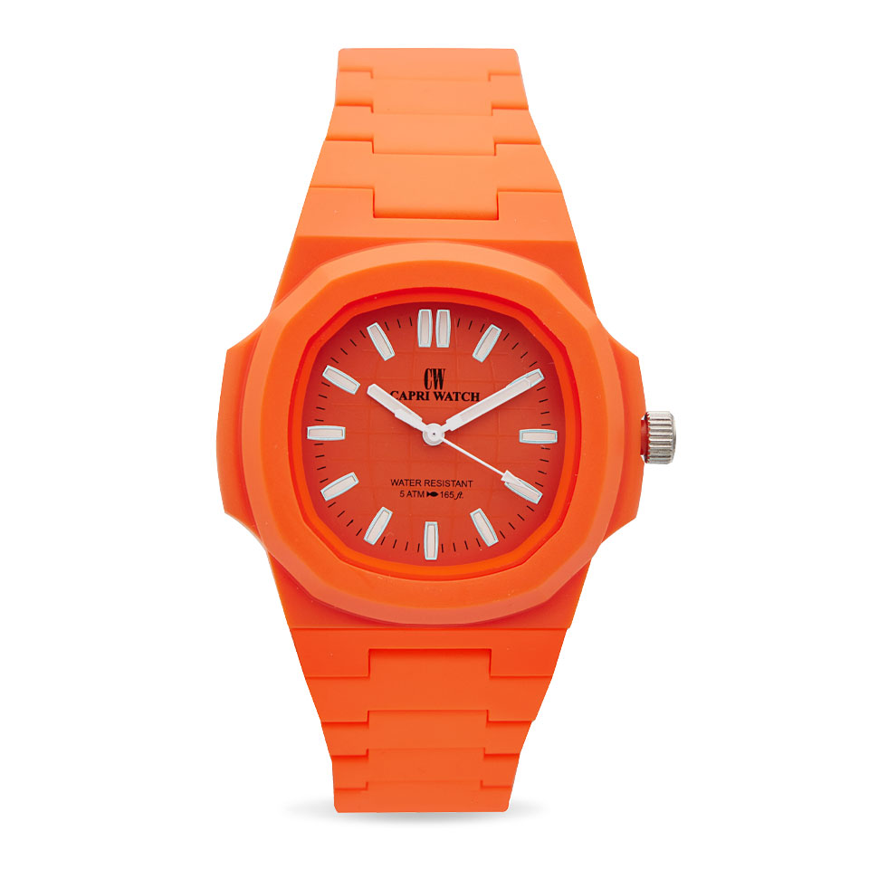 Il quadrante arancione brillante, perfettamente coordinato al cinturino, è arricchito da indici bianchi in rilievo che garantiscono una lettura chiara dell’ora e un contrasto visivo elegante.