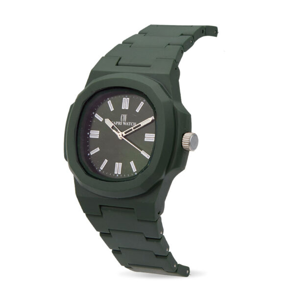 Il design monocromatico verde, con cassa e cinturino in policarbonato leggero e resistente, dona un look originale e contemporaneo, ideale per outfit casual e sportivi.