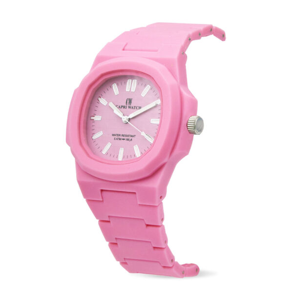 Con la sua delicata tonalità rosa chiaro, l’orologio unisex Rainbow Pink è la scelta ideale per chi predilige colori tenui e luminosi anche negli accessori sportivi. La cassa e il cinturino in policarbonato opaco, entrambi leggeri e resistenti, garantiscono una vestibilità comoda e una piacevole sensazione al polso. Il quadrante rosa, perfettamente coordinato al cinturino, è arricchito da indici bianchi in rilievo che assicurano un’eccellente leggibilità e aggiungono un tocco grafico essenziale.