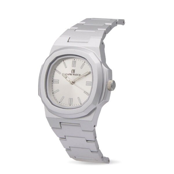 Il quadrante silver è arricchito da indici bianchi in rilievo, che garantiscono una lettura chiara e un design pulito ed essenziale. Il risultato è un orologio sobrio ma non banale, perfetto per chi ama accessori curati nei dettagli.