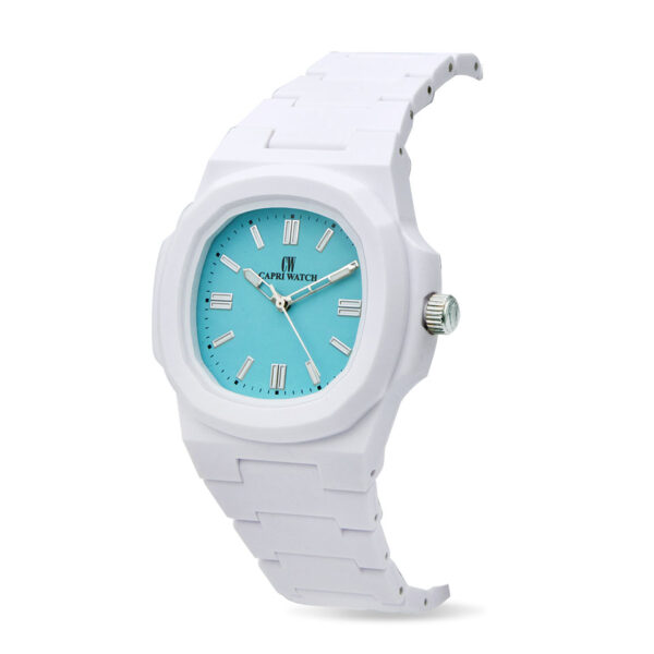 L’orologio unisex Rainbow White con quadrante light blue si distingue per il suo design luminoso e dall’animo estivo. La cassa e il cinturino in policarbonato bianco opaco, leggeri e resistenti, assicurano una vestibilità confortevole e una piacevole sensazione al polso. Il quadrante azzurro chiaro, in netto contrasto con il bianco, è impreziosito da indici bianchi in rilievo che garantiscono un’ottima leggibilità e donano un tocco di freschezza visiva.