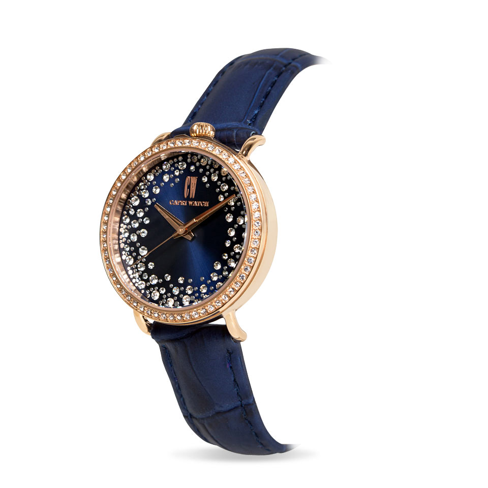 Scopri l’eleganza dell’orologio Retrò Mini Storm con il quadrante blu effetto soleil impreziosito da una raffinata tempesta di cristalli Swarovski. La ghiera, arricchita da cristalli Swarovski lungo il perimetro, è completata dalla corona a ore 12 che aggiunge un tocco di unicità. La cassa in acciaio placcato oro rosa conferisce un aspetto delicato e femminile completato dal cinturino blu in pelle.