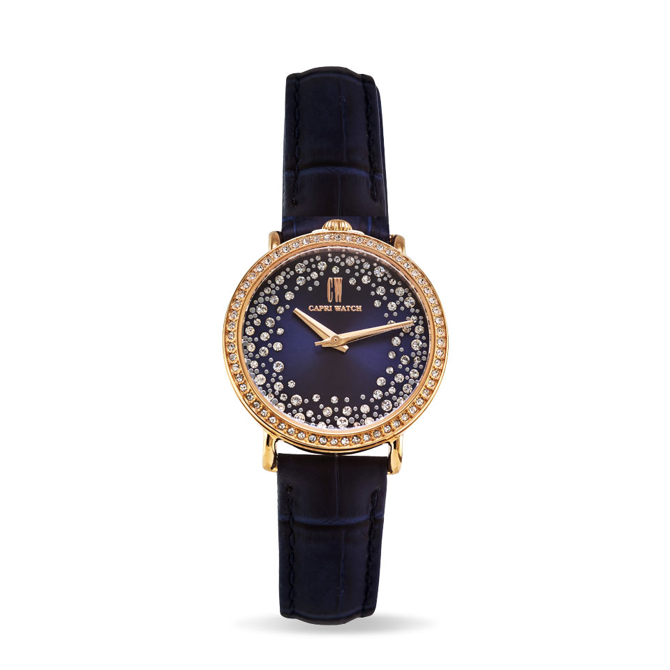 L’Orologio Retrò First è un omaggio al fascino della tradizione. Il quadrante riproduce il design dell’orologio del campanile della Piazzetta di Capri, mentre la ghiera è impreziosita da piccoli cristalli Swarovski. La corona posizionata a ore 12 aggiunge un dettaglio distintivo, la cassa in acciaio si abbina perfettamente al cinturino in pelle Blu Royal, per un’eleganza classica.
