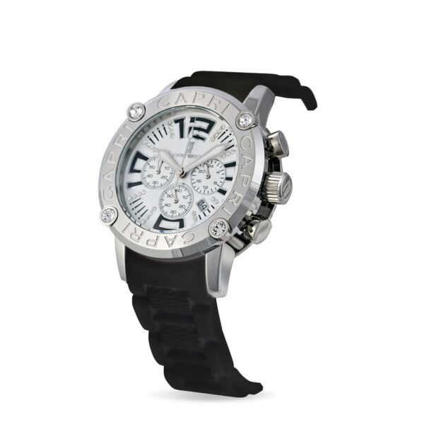Eleganza e prestazioni si incontrano nell’orologio Chrono Black Lady Capricapri, pensato per la donna che cerca uno stile deciso. La cassa robusta e i contatori del cronografo aggiungono funzionalità, mentre il cinturino in pelle nera completa il tutto con eleganza.