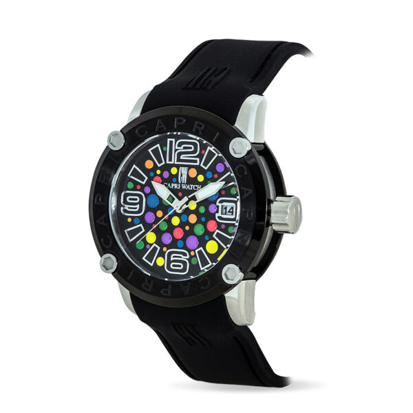 Realizzato con cassa in acciaio e cinturino in silicone nero, è pensato per chi ha il coraggio di esprimere la propria personalità attraverso un accessorio unico e vibrante. - 230,00 €