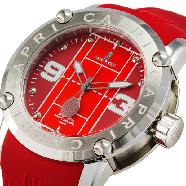 L’Orologio Tennis nella variante rossa si distingue per il quadrante con il design originale del campo da tennis, perfetto per gli appassionati di sport e stile unico. La ghiera e la cassa in acciaio conferiscono robustezza e un look moderno.
