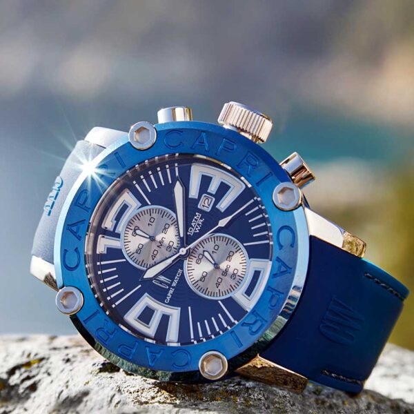 L’Orologio Chrono Oversize First unisce il design imponente alla raffinatezza del quadrante ispirato all’orologio del campanile di Capri. La ghiera e la cassa oversize in acciaio offrono una struttura resistente e durevole. Il cinturino in silicone blu assicura una vestibilità perfetta dal sapore quotidiano.