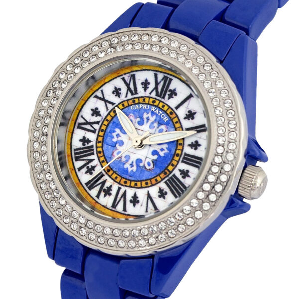 Lasciati conquistare dal fascino mediterraneo dell’orologio Ceramic First, un modello unico che celebra l’eleganza dell’isola di Capri. Il suo quadrante riproduce fedelmente il design del celebre orologio del campanile della Piazzetta, mentre la ghiera è impreziosita da una miriade di scintillanti cristalli Swarovski, per un tocco di luce e raffinatezza. Realizzato interamente in ceramica blu lucida, con cassa e cinturino a maglie, questo orologio unisce stile, resistenza e leggerezza. L’accessorio perfetto per distinguersi con classe.