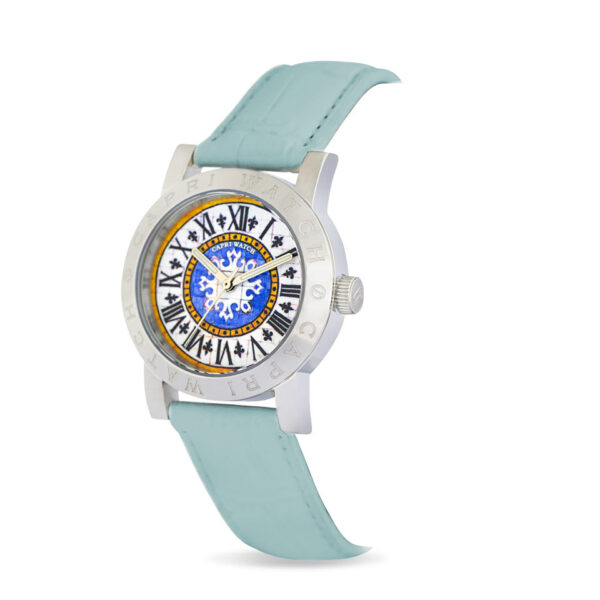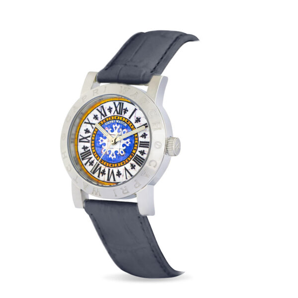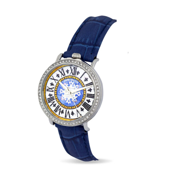 L’Orologio Retrò First Blue Royal si ispira al fascino storico del campanile della piazzetta, reinterpretato in un design elegante e senza tempo. Il quadrante riproduce fedelmente il motivo dell’orologio del celebre campanile, arricchito da una ghiera impreziosita da piccoli cristalli Swarovski che donano brillantezza e raffinatezza. La corona posizionata a ore 12 richiama lo stile vintage degli orologi da taschino. Il cinturino in pelle Blu Royal aggiunge un tocco di colore, ideale per chi desidera un accessorio elegante e originale.