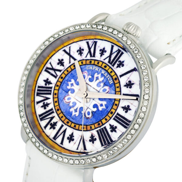 L’Orologio Retrò First White si ispira al design inconfondibile dell’orologio del campanile della Piazzetta di Capri, con un quadrante che ne riproduce i dettagli. La ghiera è arricchita da piccoli cristalli Swarovski, che donano un tocco di raffinata lucentezza. La cassa in acciaio e il cinturino bianco in pelle completano un design intramontabile.