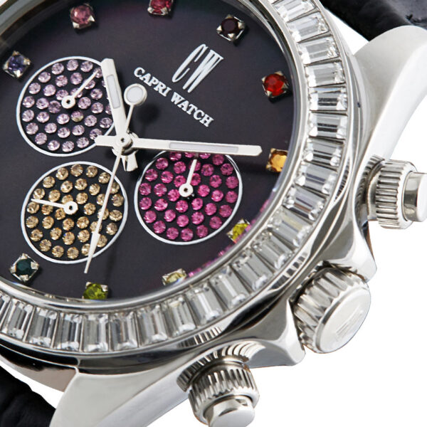 La ghiera in acciaio è impreziosita da una selezione di baguette Swarovski multicolore. La cassa e il cinturino in pelle nera completano il look con un tocco classico e sofisticato. - 400,00 €