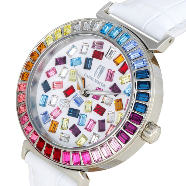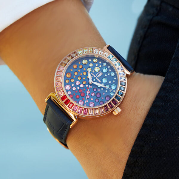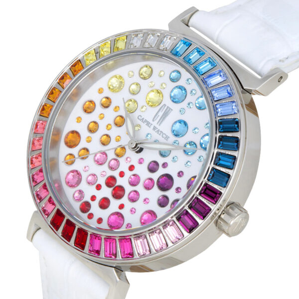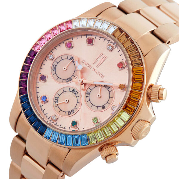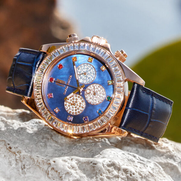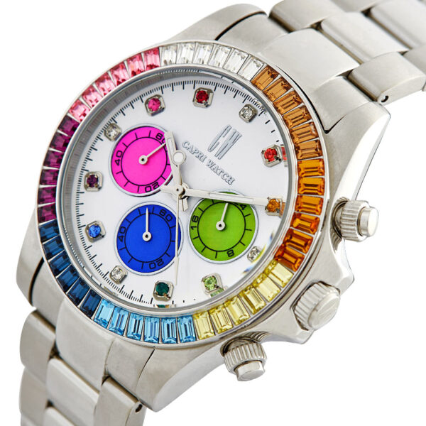 Il Cronografo Rossella è un’esplosione di luce e colore, pensato per chi ama distinguersi con eleganza. Il quadrante bianco è valorizzato da contatori crono multicolore e indici luminosi, mentre la ghiera è impreziosita da baguette in cristalli Swarovski colorati, per un effetto brillante e sofisticato.